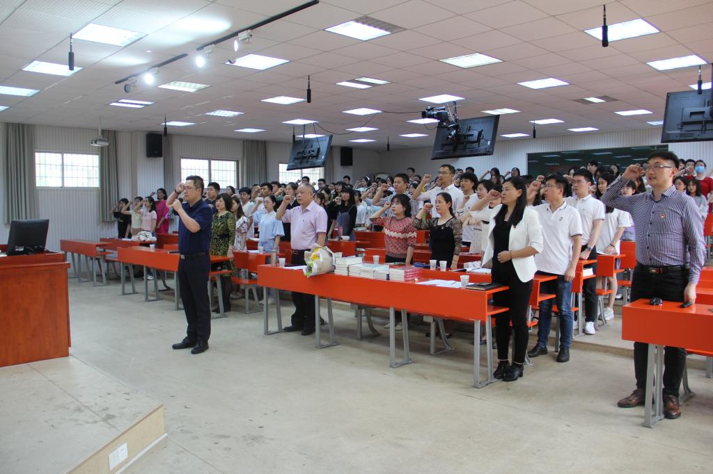 会上,全体师生党员同志佩戴党徽、面向党旗,举起右拳,进行了铿锵有力的宣誓。入党誓词虽然仅有短短80字,却字字直抵人心,句句直言忠诚。这是初心使命的宣示,这是接续奋斗的再出发。