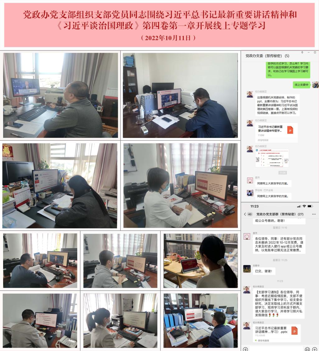 日,党政办党支部组织支部党员同志围绕习近平总书记最新重要讲话精神和《习近平谈治国理政》第四卷第一章开展线上专题学习。